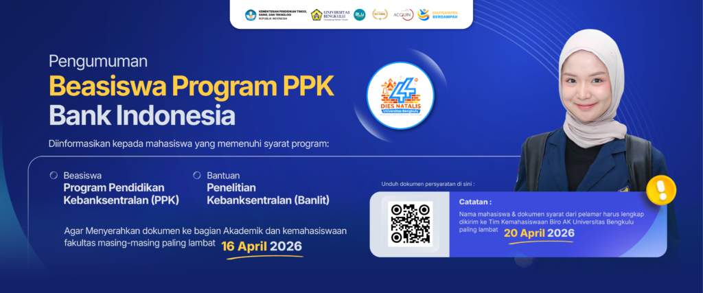 Dalam rangka memperingati Dies Natalis ke-44, Universitas Bengkulu menghadirkan rangkaian kegiatan menarik sepanjang April 2026. Mulai dari lomba, kegiatan sosial, temu alumni, hingga kuliah umum dan workshop internasionalisasi jurnal. Mari bersama-sama memeriahkan dengan semangat:Membangun | Bertransformasi | Berdampak Catat tanggalnya dan jangan sampai terlewat! Unduh logo Dies Natalis ke-44 di sini