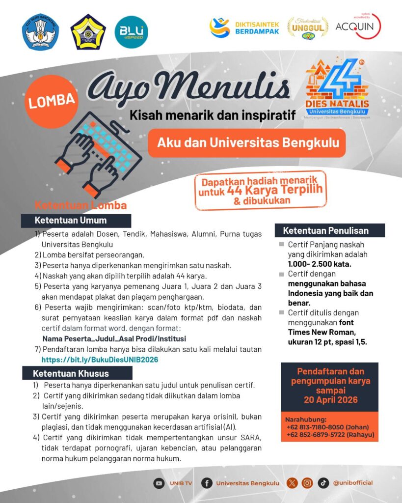 - Pendaftaran lomba hanya bisa dilakukan satu kali melalui tautan https://bit.ly/BukuDiesUNIB2026