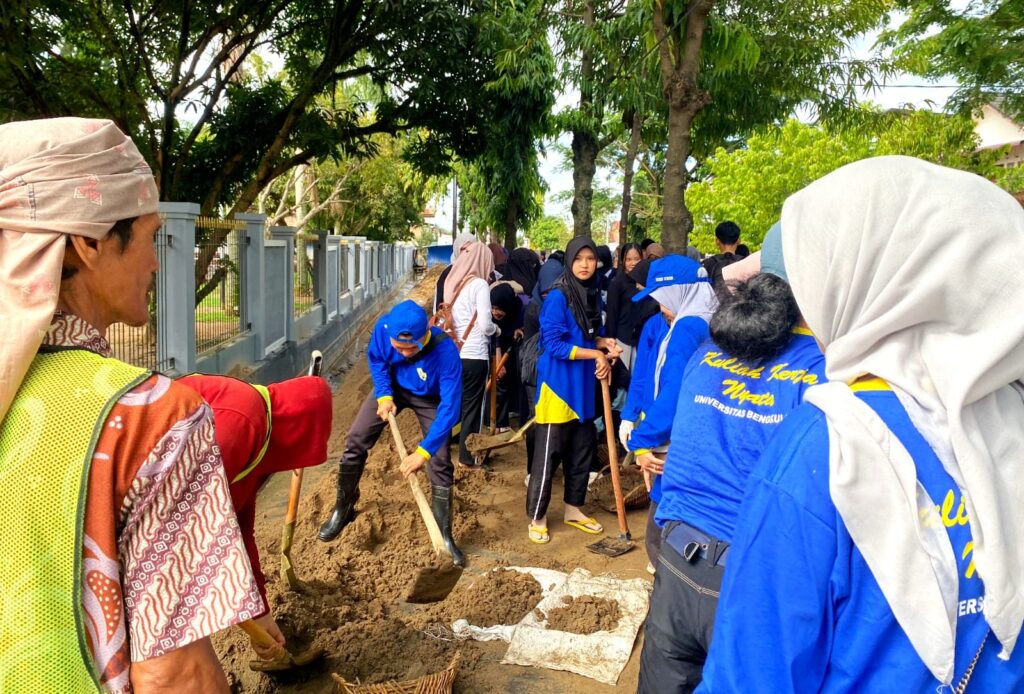 Para peserta KKN Tematik Unib bahu membahu membersihkan lumpur sisa bencana banjir.(foto:ist-Risanti)