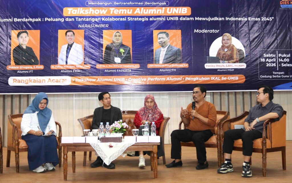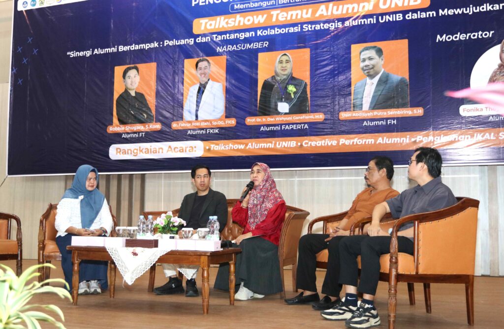 Talkshow berlangsung dinamis dengan menghadirkan narasumber dari beragam latar belakang, yakni akademisi Prof. Dr. Ir. Dwi Wahyuni Ganefianti, MS (Alumni Fakultas Pertanian), Anggota DPRD Provinsi Bengkulu Usin Abdisyah Putra Sembiring, SH (Alumni Fakultas Hukum), praktisi digital Robbie Shugara, S.Kom (Alumni Fakultas Teknik), serta tenaga kesehatan profesional dr. Fahrur Rozi Illahi, Sp.OG, FICS (Alumni FKIK). Diskusi tersebut dipandu oleh moderator Fonika Thoyib, S.Sos, M.I.Kom, alumni FISIP Unib.
