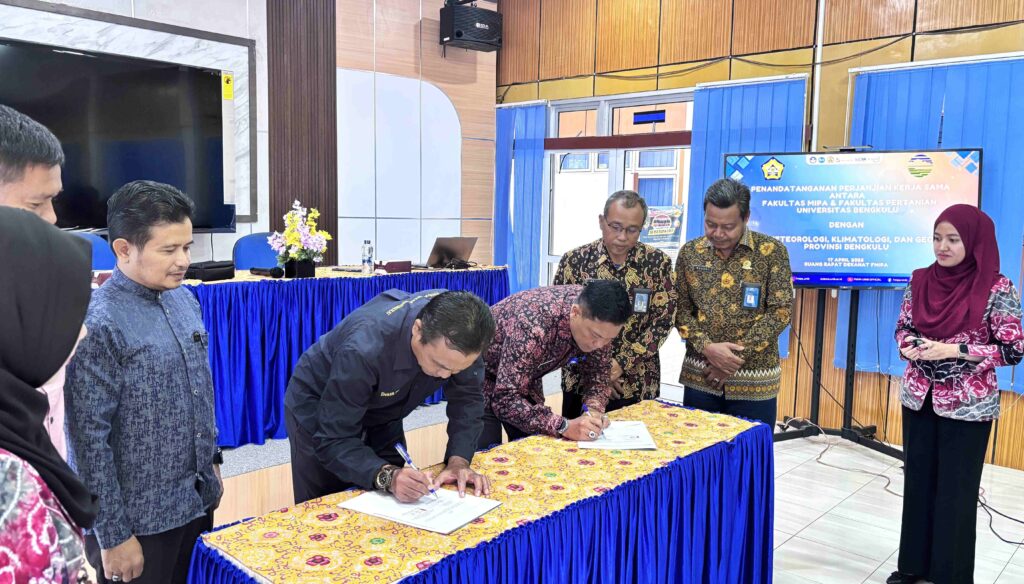 Universitas Bengkulu (Unib) kembali memperluas jejaring kerja sama strategis. Kali ini, Fakultas Matematika dan Ilmu Pengetahuan Alam (FMIPA) bersama Fakultas Pertanian (FP) Unib menjalin kolaborasi dengan Badan Meteorologi, Klimatologi, dan Geofisika (BMKG) Provinsi Bengkulu melalui penandatanganan nota kesepahaman (MoU), Jumat (17/4/2026).