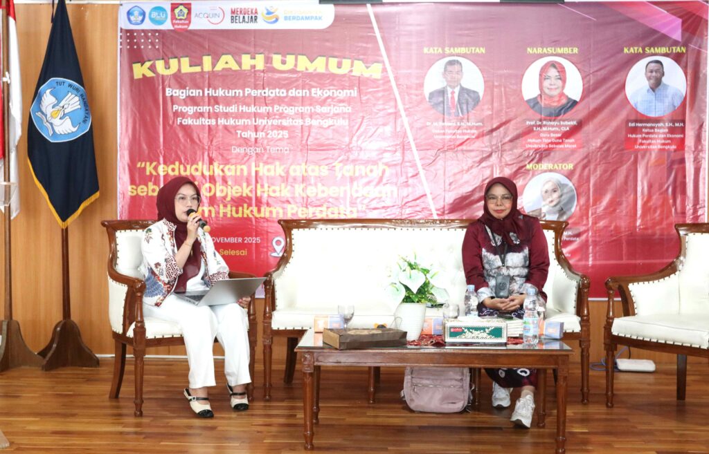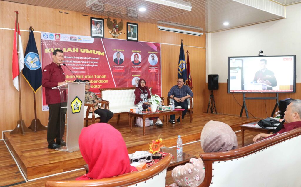 Fakultas Hukum Universitas Bengkulu (FH Unib) kembali menghadirkan atmosfer akademik yang dinamis melalui kuliah umum bersama pakar hukum agraria nasional. Ahli hukum tata guna tanah sekaligus Guru Besar Fakultas Hukum Universitas Sebelas Maret (UNS), Prof. Dr. Rahayu Subekti, S.H, M.Hum, hadir untuk berbagi wawasan mendalam tentang hukum tanah kepada mahasiswa FH Unib di Ruang Internasional 1 Dekanat FH Unib, Kamis (27/11/2025).