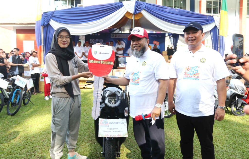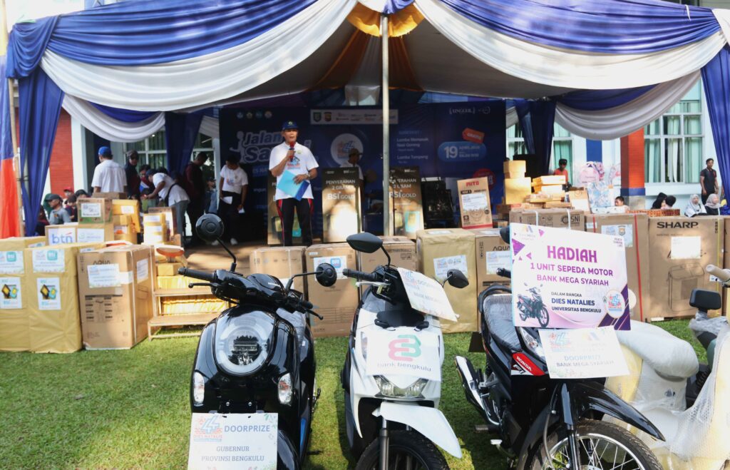 “Hadiah utama berupa tiga unit sepeda motor merupakan persembahan dari Gubernur Bengkulu, Bank Bengkulu, dan Bank Mega Syariah. Selain itu, juga tersedia sepeda listrik, sepeda gunung, sepeda lipat, kulkas, mesin cuci, kompor gas, serta ratusan kipas angin dan berbagai perlengkapan rumah tangga lainnya,” jelasnya.