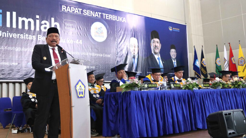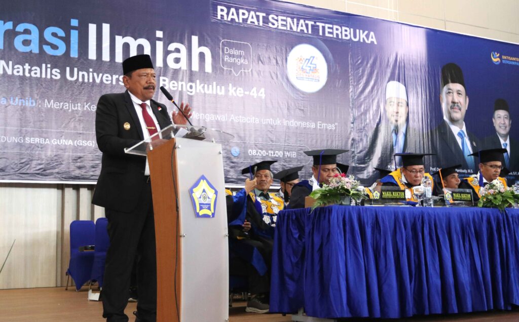 Wakil Gubernur Bengkulu Ir. H. Mian menyampaikan rasa bangga dan apresiasi atas perkembangan pesat Universitas Bengkulu (Unib) saat memberikan sambutan pada Rapat Senat Terbuka dalam rangka Orasi Ilmiah Dies Natalis ke-44 Unib, di Gedung Serba Guna (GSG) Unib, Jumat (24/4/2026).