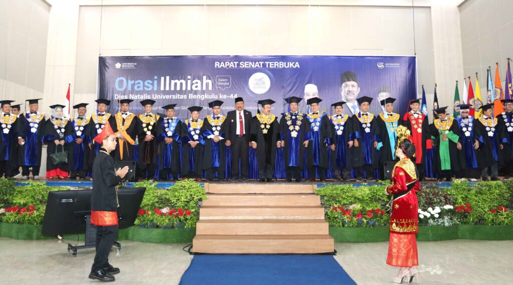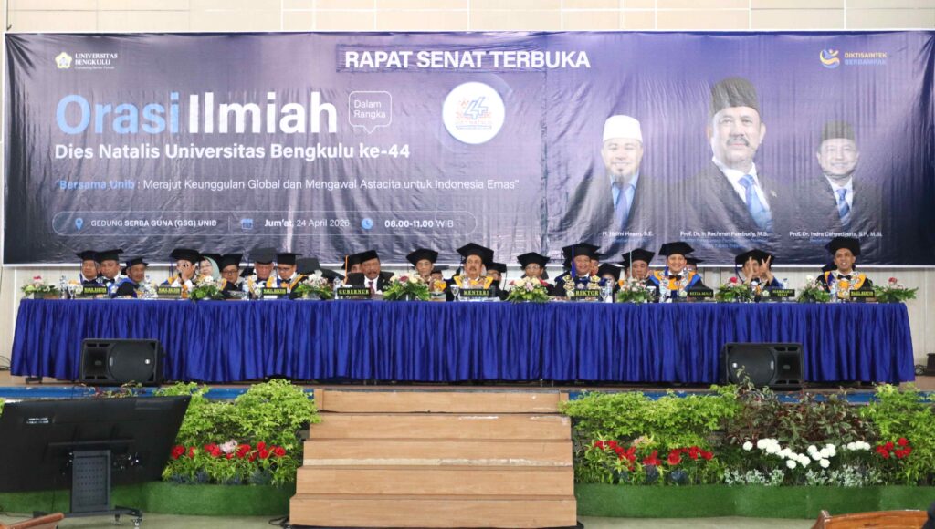 Kegiatan ini dibuka oleh Ketua Senat Universitas Bengkulu, Prof. Dr. Herawan Sauni, S.H., M.S, dan dihadiri anggota senat, para guru besar, pimpinan universitas dan fakultas, dosen, tenaga kependidikan, serta ribuan mahasiswa. Hadir pula unsur Forum Koordinasi Pimpinan Daerah (Forkopimda) Provinsi Bengkulu dan para pimpinan bank mitra Unib, menambah semarak momentum puncak Dies Natalis ke-44 Universitas Bengkulu. [Purna Herawan | Humas].