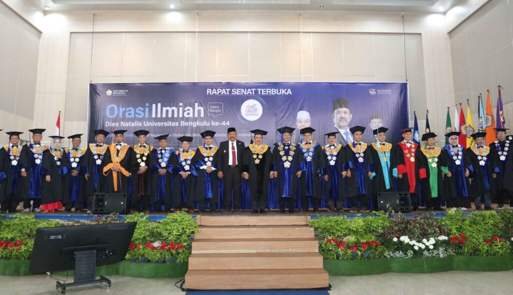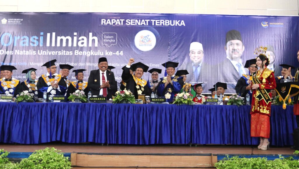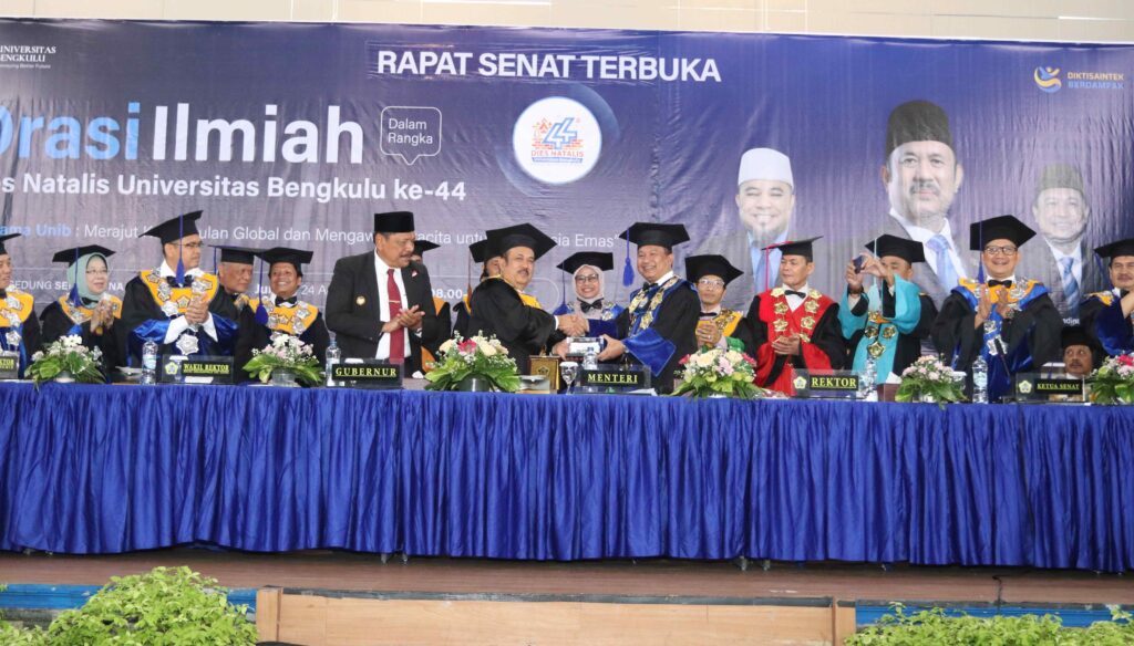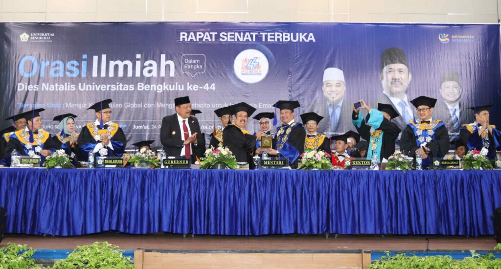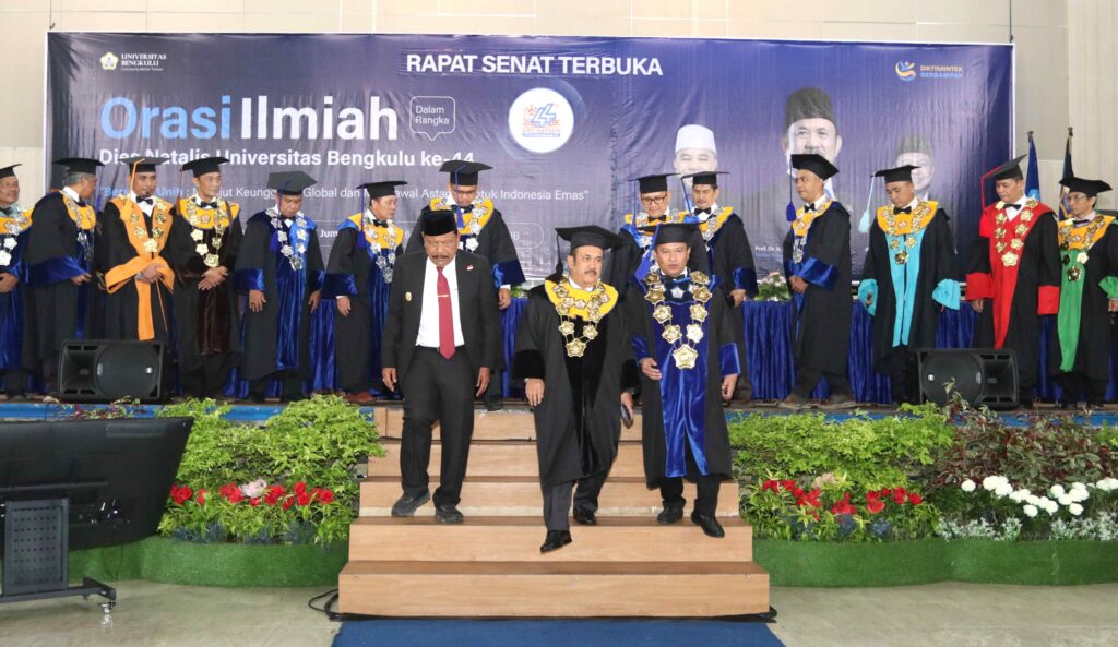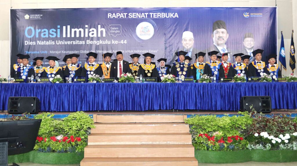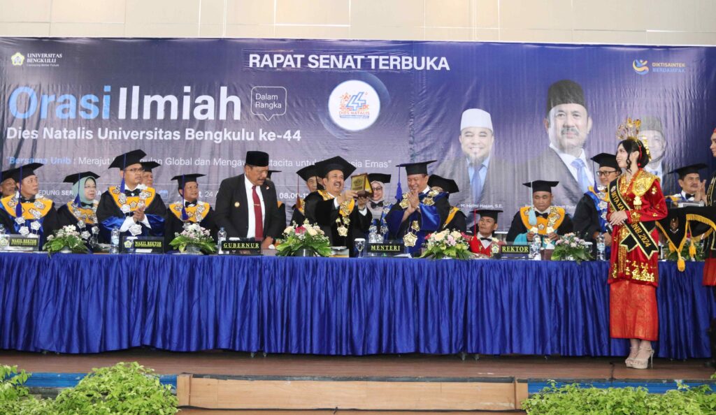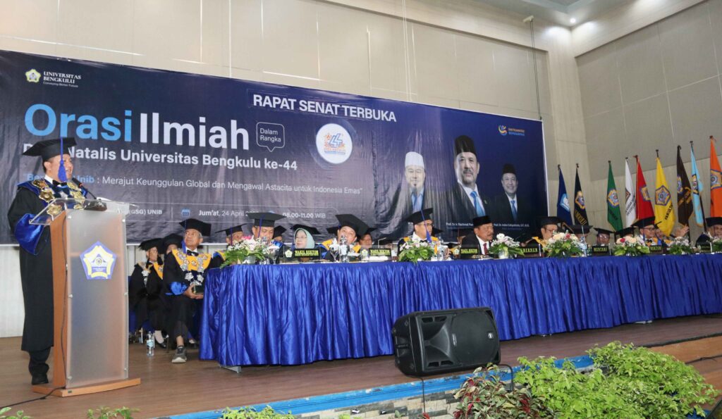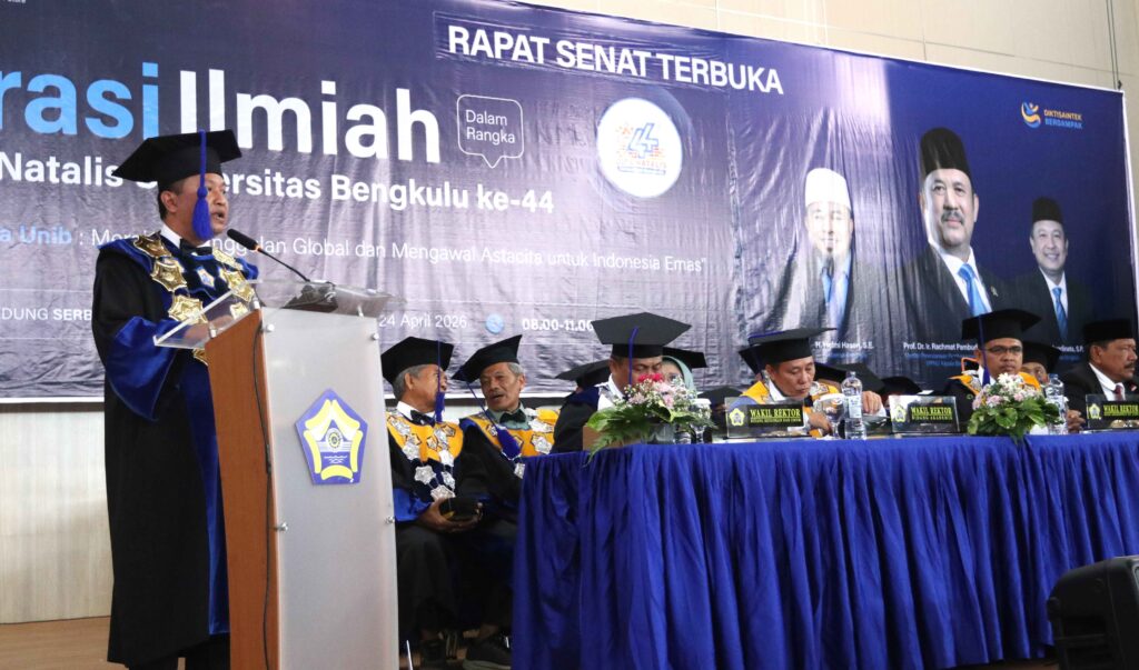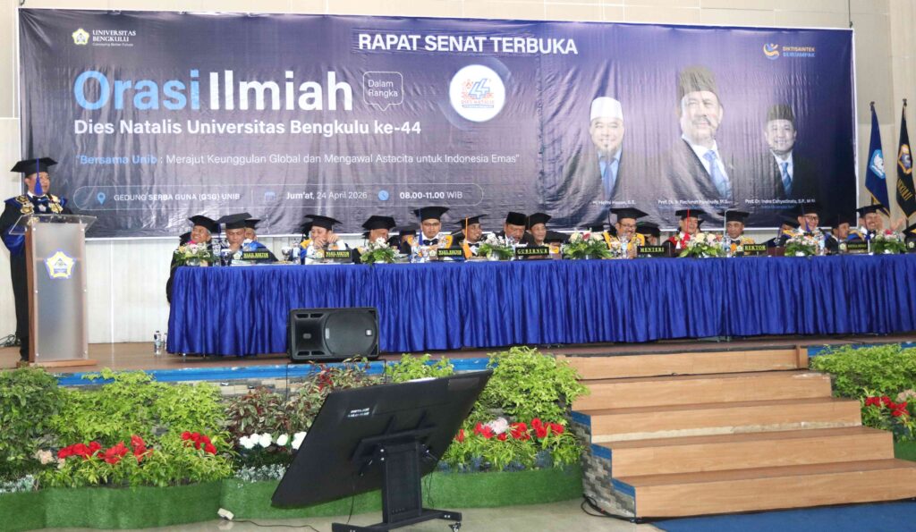 Genap berusia 44 tahun pada 24 April 2026, Universitas Bengkulu (Unib) memperingati hari jadinya dengan menggelar Rapat Senat Terbuka di Gedung Serba Guna (GSG) Unib. Momentum puncak dies natalis ini diisi dengan orasi ilmiah yang menghadirkan Menteri Perencanaan Pembangunan Nasional (PPN)/Kepala Bappenas Republik Indonesia, Prof. Dr. Ir. Rachmat Pambudy, MS.