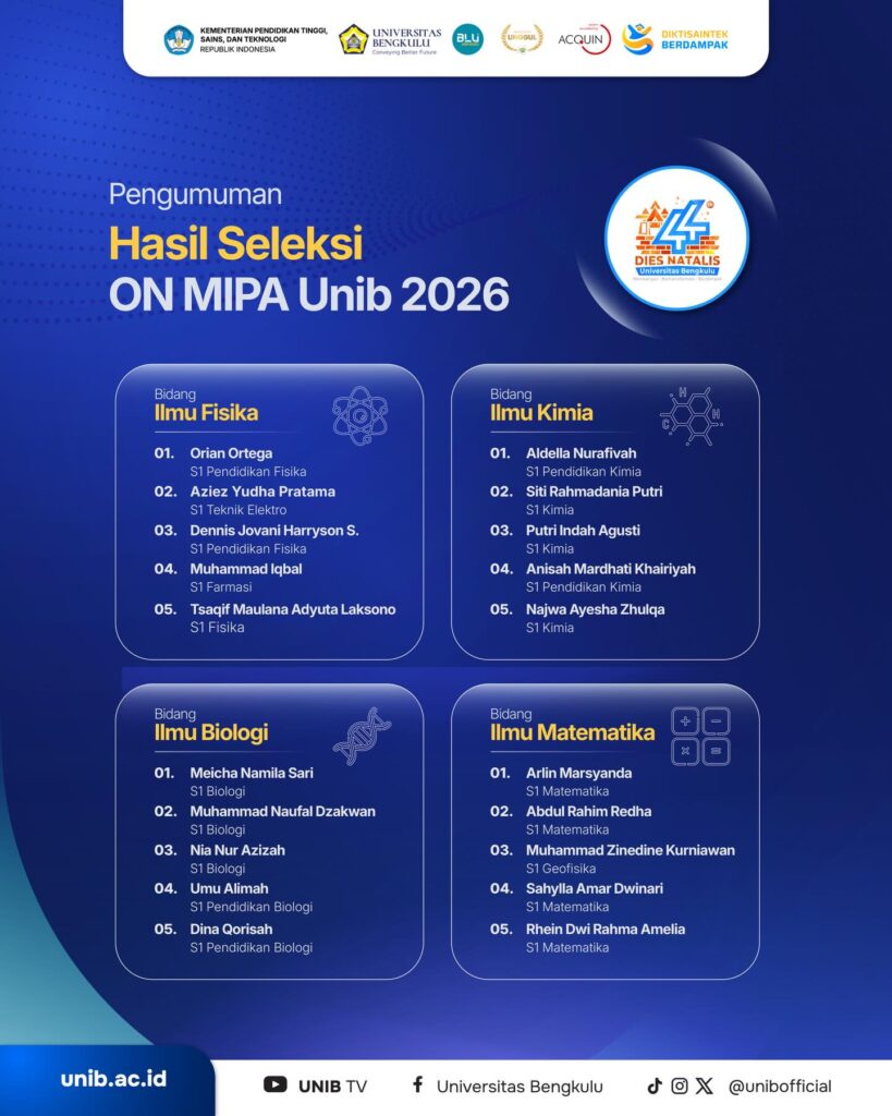 Selamat! Kami ucapkan kepada para mahasiswa/i terbaik yang telah berhasil lolos seleksi ON MIPA tingkat Universitas Bengkulu tahun 2026 dalam rangka menyambut Dies Natalis UNIB ke-44.