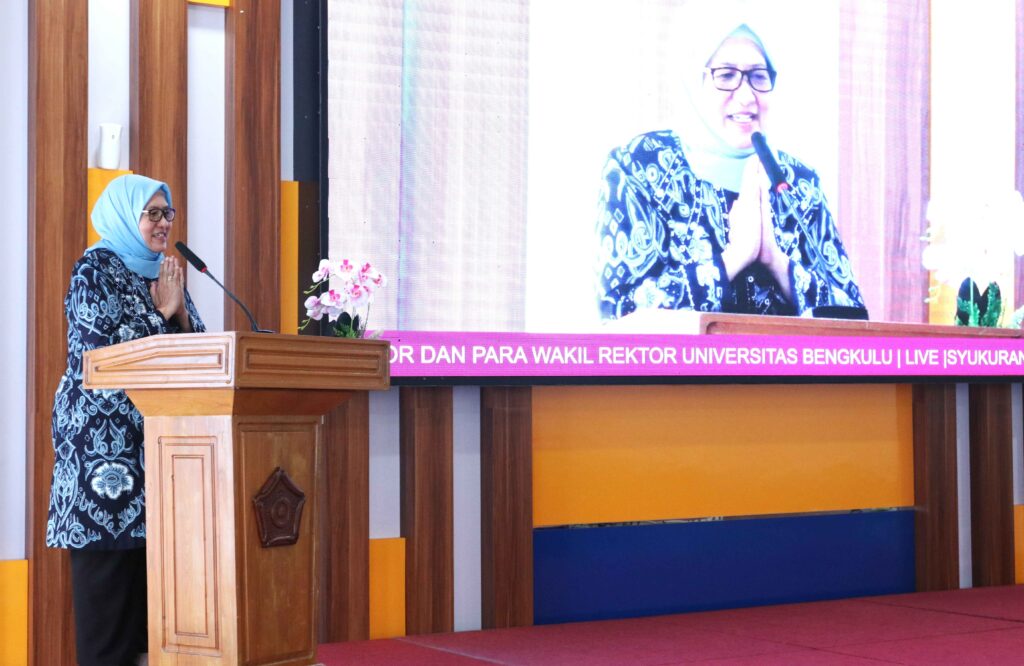 Rektor Unib Dr. Retno saat menyampaikan capaian Unib dan mengucapkan kata perpisahan karena akan memasuki masa akhir jabatannya.(foto:hms1)