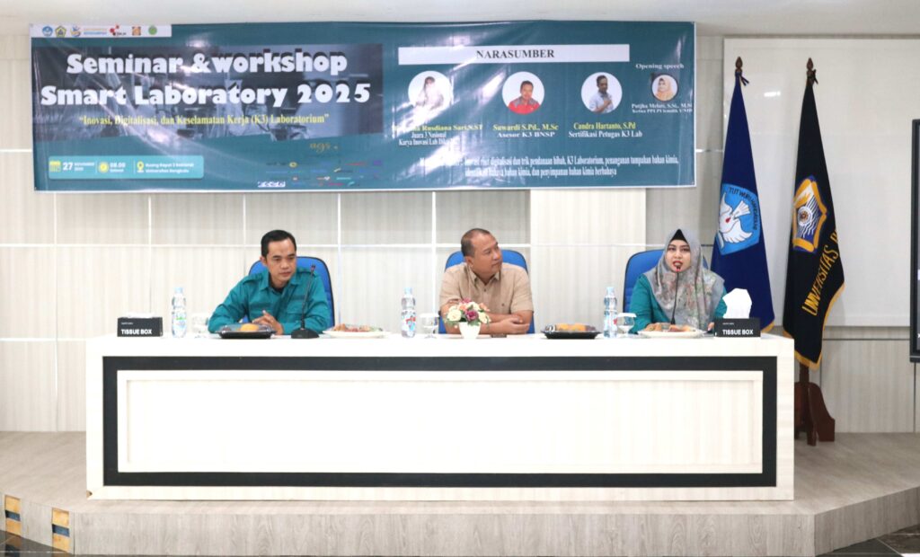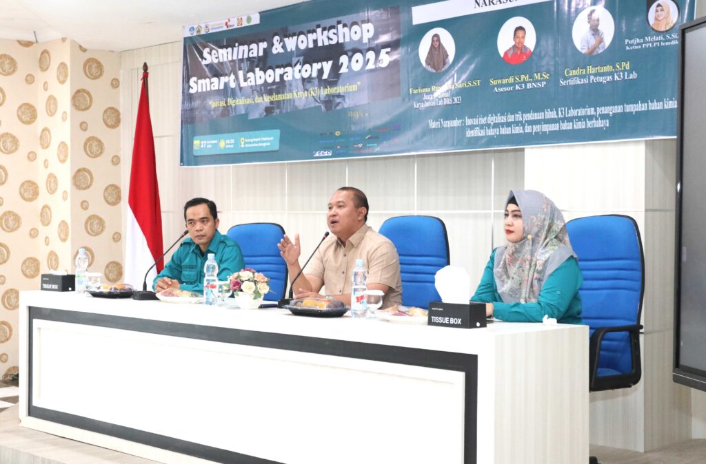 Perhimpunan Pengelola Laboratorium Lembaga Pendidikan Universitas Bengkulu (PPLPI Lemdik Unib) menggelar seminar dan workshop bertajuk Smart Laboratory dengan tema “Inovasi, Digitalisasi, dan Keselamatan Kerja (K3) Laboratorium”, Kamis (27/11/2025), di Ruang Rapat III Gedung Rektorat Unib.