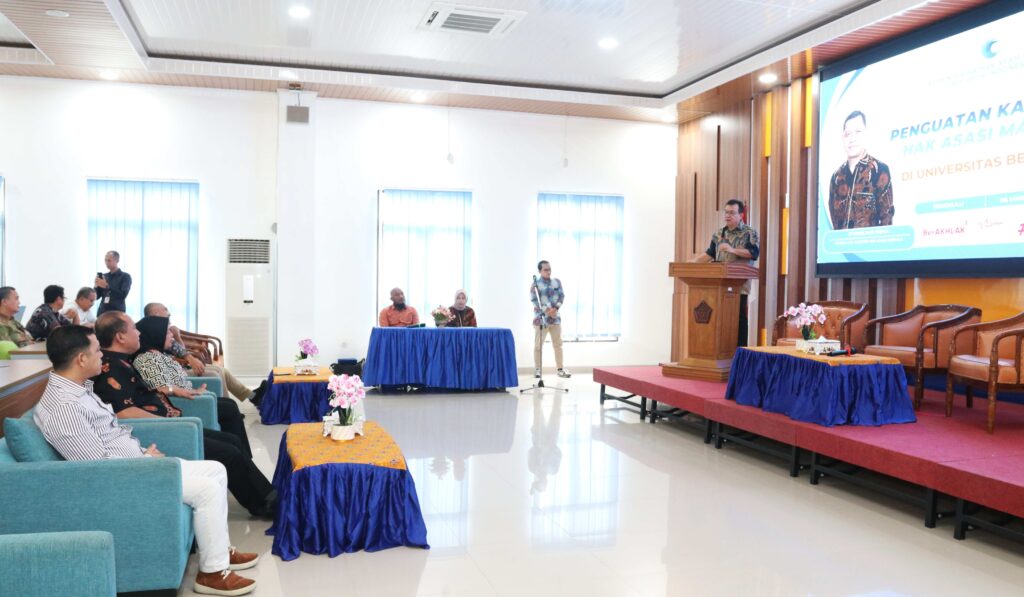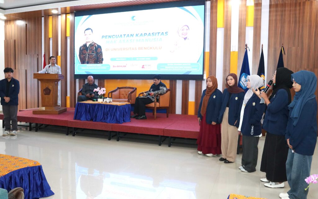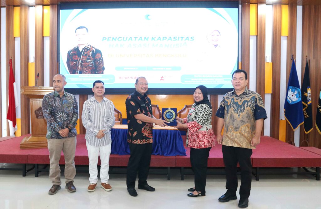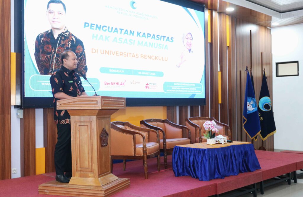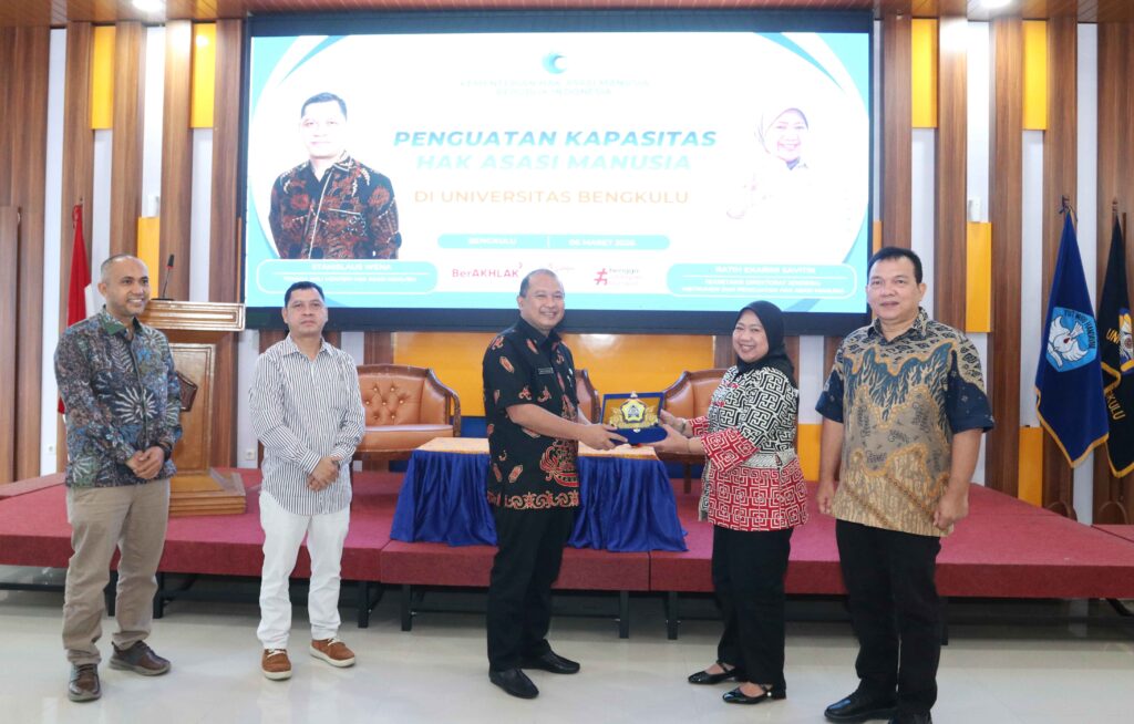 Universitas Bengkulu (Unib) menerima kunjungan dari Kementerian Hak Asasi Manusia Republik Indonesia dalam rangka kegiatan sosialisasi penguatan kapasitas Hak Asasi Manusia (HAM) bagi mahasiswa dan sivitas akademika, Jumat (6/3/2026). Kegiatan yang berlangsung di ruang rapat utama Gedung Layanan Terpadu (GLT) Unib ini dibuka secara resmi oleh Rektor Unib Prof. Dr. Indra Cahyadinata, SP, M.Si.