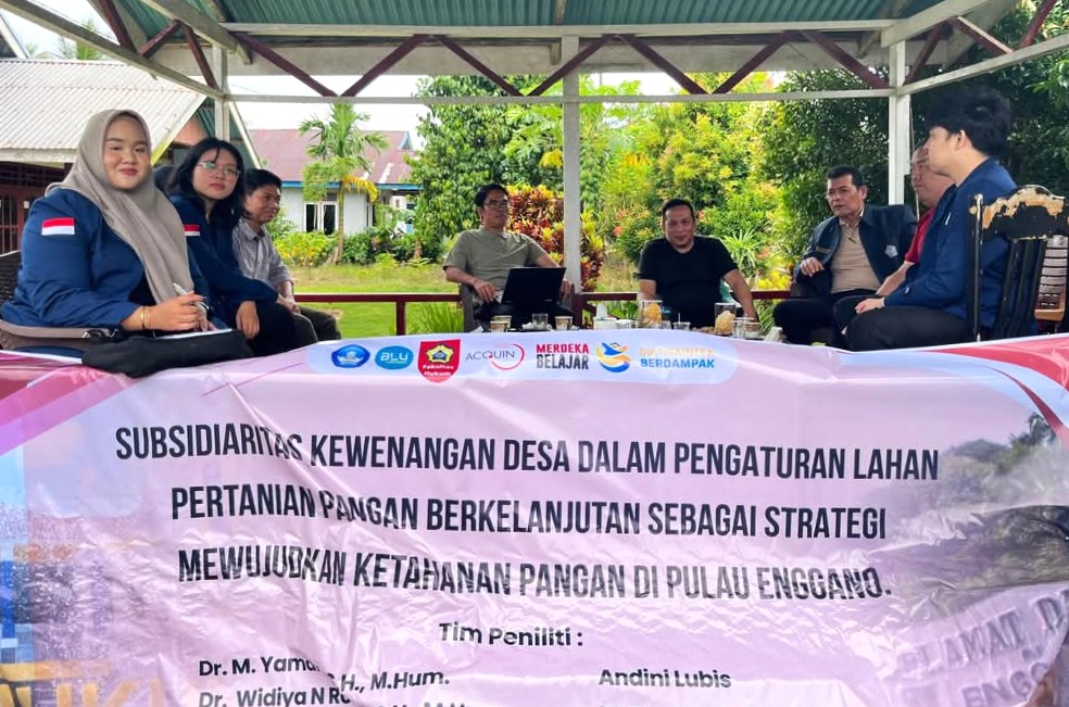 Dijelaskan, program FH Unib Berdampak di Pulau Enggano ini mencakup pendampingan penyusunan Ranperdes mengenai pengelolaan kawasan Wisata Bakblaw di Desa Meok; Ranperdes mengenai pengelolaan hutan desa danau pulau di Desa Kaana; serta mengenai subsidiaritas kewenangan desa dalam pengaturan lahan pangan sawah berkelanjutan skala desa untuk mewujudkan desa swasembada pangan di Desa Malakoni dan sekitarnya.