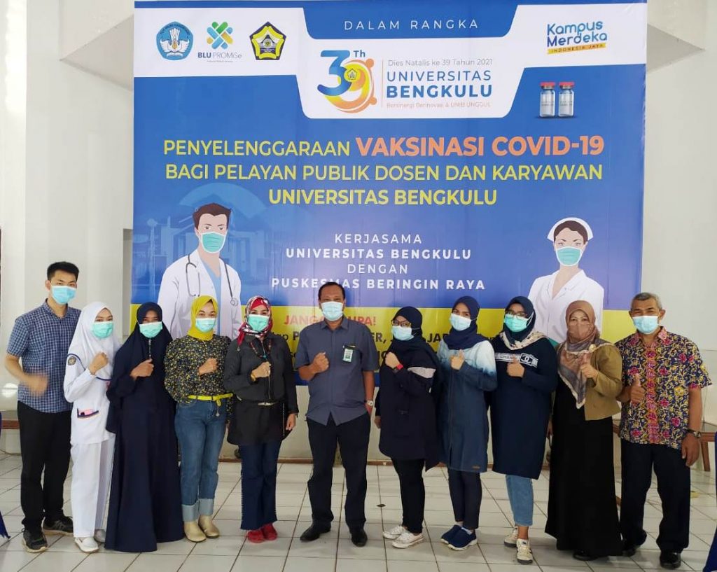 Untuk kegiatan vaksinasi covid-19 di gedung C dilaksanakan atas kerjasama UNIB dengan Pusat Kesehatan Masyarakat (Puskesmas Perawatan) Beringin Raya diikuti 76 orang dan kegiatan vaksinasi di GSG nanti UNIB bekerjasama dengan Puskesmas Muara Bangkahulu diikuti 250 orang.